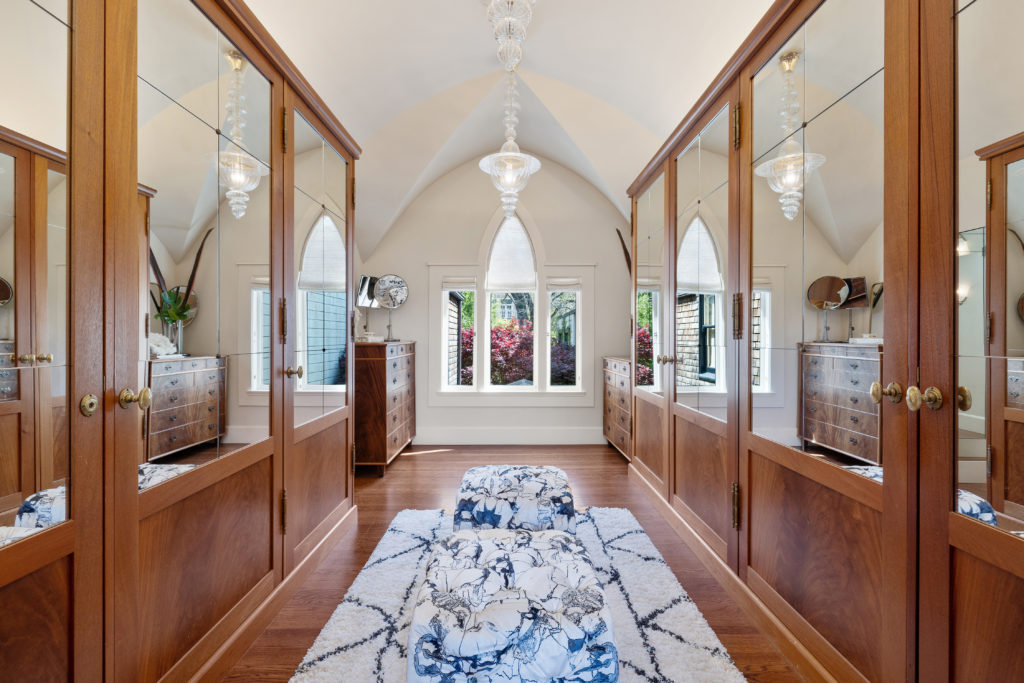The second level is devoted to the two-bath primary bedroom suite, and includes this vaulted dressing room lined with mirrored custom closets.
